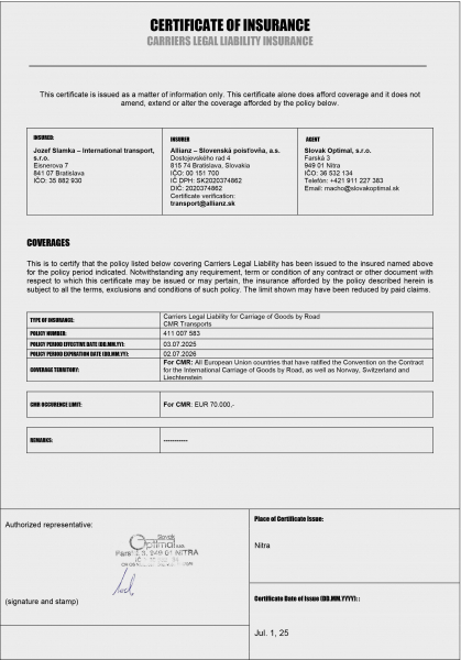 Dokumenty na stiahnutie Prepravný poriadok Jozef Slamka International transport s.r.o. Certifikát CRM